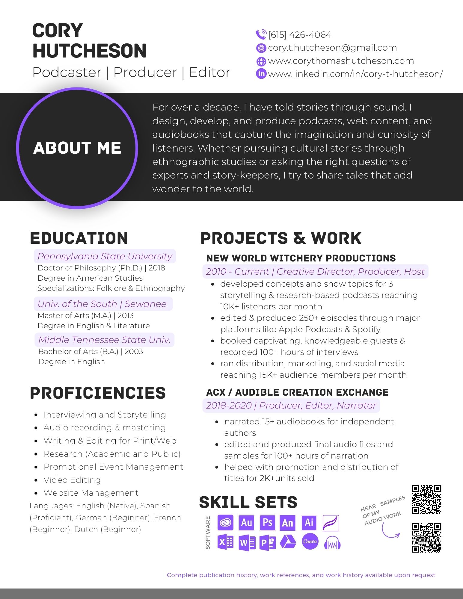 My work in podcasting has spanned over a decade and covers three shows that I’ve produced or co-produced, written, edited, and done creative work and marketing for. I’ve also appeared on many podcasts as a guest and helped other people launch their own successful shows. For more on my experience as a podcaster, narrator, and audio editor, please see my resume.
